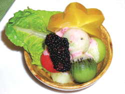 4.將生菜、西芹、綜合水果擺盤後,擠上調好的醬汁,最後用桑椹裝飾即可。