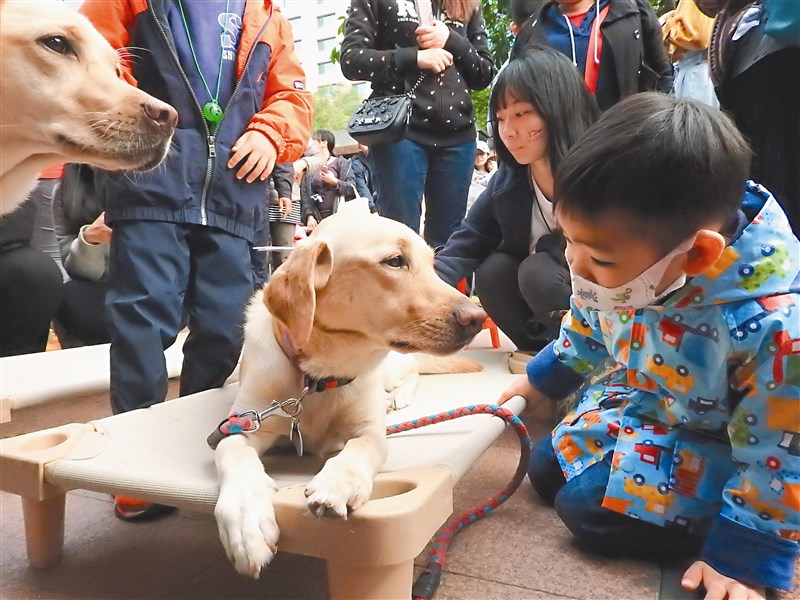惠光導盲犬學校昨天帶出五隻導盲犬,無辜萌樣吸引民眾撫摸、合照,人氣超旺。該校教育推廣組主任彭筱涵強調,平常導盲犬訓練或工作時,需遵守不撫摸、不餵食、不呼叫、不拒絕、主動詢問的「四不一問」原則,但昨天導盲犬們「不上班」,民眾可盡情合照、撫摸。