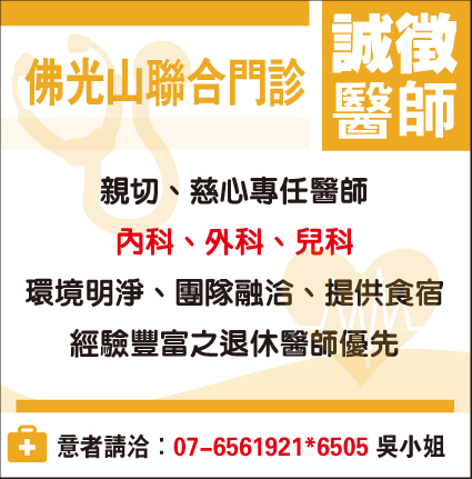 佛光山聯合門診 誠徵醫師 |2017.12.02 語音朗讀 188觀看次 字級 大 中 小 親切、慈心專任醫師 內科、外科、兒科 環境明淨、團隊融洽、提供食宿經驗豐富之退休醫師優先 意者洽詢:07-6561921分機6505 吳小姐 前一篇文章 貴妃木桶 歡慶12周年特賣 下一篇文章 佛光山南台別院講座 熱門新聞 01【讓愛自由】纏繞與獨立之間2026.04.0202明德水庫蓄水量僅27% 今起供4停42026.04.0103新生首次到校2026.04.0204星雲大師靈骨分燈日本 法燈長明2026.04.0105星雲大師靈骨分燈泰國 化益世人2026.04.02069公尺高恐龍 現身澄清湖2026.04.0107東京櫻花滿開2026.04.0108打字機重返課堂 對抗AI代寫2026.04.0209中美並重 鄭麗文傳6月訪美2026.04.0110睽違53年 NASA載人繞月1日升空2026.04.01 訂閱電子報 台北市 天氣預報 台灣一週天氣預報 相關報導 以文字護持人間福報運動睡眠新科技 養生保健新利器房仲第一品牌 永慶加薪3% 體驗美好手作 製皂幸福時光 博愛社大春季班招生中 薩克斯風吹奏春季班 人間大學台中分校招生中 跨越十年縱橫南半球到北半球 《行者》新書上市
