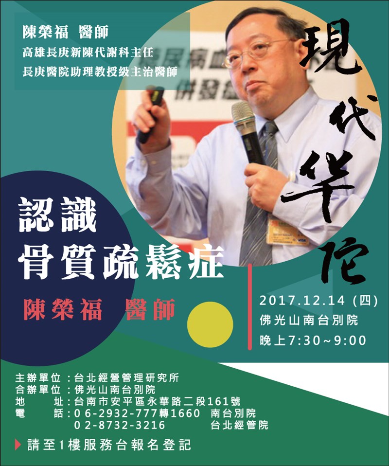 佛光山南台別院講座 |2017.12.02 語音朗讀 283觀看次 字級 大 中 小 佛光山南台別院講座 邀請高雄長庚新主任 陳榮福醫生主講 歡迎大眾前往聆聽 時間:2017.12.14(四) 晚上7:30~9:00 地址:台南市安平區永華路二段161號 電話:06-2932-777轉1660 南台別院 02-8732-3216 台北經管院 前一篇文章 佛光山聯合門診 誠徵醫師 下一篇文章 一筆字文創三好兩用筆袋 熱門新聞 01【讓愛自由】纏繞與獨立之間2026.04.0202新生首次到校2026.04.0203明德水庫蓄水量僅27% 今起供4停42026.04.0104星雲大師靈骨分燈日本 法燈長明2026.04.0105星雲大師靈骨分燈泰國 化益世人2026.04.0206東京櫻花滿開2026.04.01079公尺高恐龍 現身澄清湖2026.04.0108中美並重 鄭麗文傳6月訪美2026.04.0109打字機重返課堂 對抗AI代寫2026.04.0210睽違53年 NASA載人繞月1日升空2026.04.01 訂閱電子報 台北市 天氣預報 台灣一週天氣預報 相關報導 以文字護持人間福報運動睡眠新科技 養生保健新利器房仲第一品牌 永慶加薪3% 體驗美好手作 製皂幸福時光 博愛社大春季班招生中 薩克斯風吹奏春季班 人間大學台中分校招生中 跨越十年縱橫南半球到北半球 《行者》新書上市