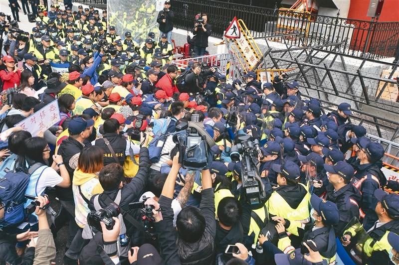 立院外勞團號召百人到群賢樓前召開記者會要求停止修法,呼籲勞工下班後聲援,會後勞團也繞行立法院一周表達抗議。過程中,勞團擬衝進立法院,和警方爆發推擠衝突(見圖/楊萬雲),還有人向立法院丟擲雞蛋。