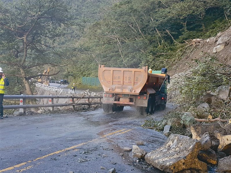 蘇花公路一一四公里處,二日起出現大量土石崩落,工程單位昨天早上七時清出一車道,準時放行。 圖/公路總局提供