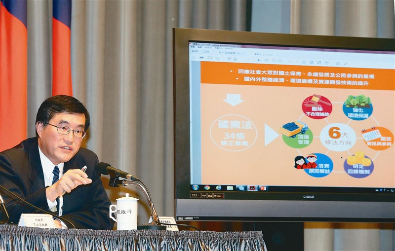 行政院表示,本次《礦業法》修正草案有六大重點,包括未來將會管制總開採量、補辦環評、取得原住民族或部落同意或參與、開放資訊參與、回饋機制及刪除霸王條款。