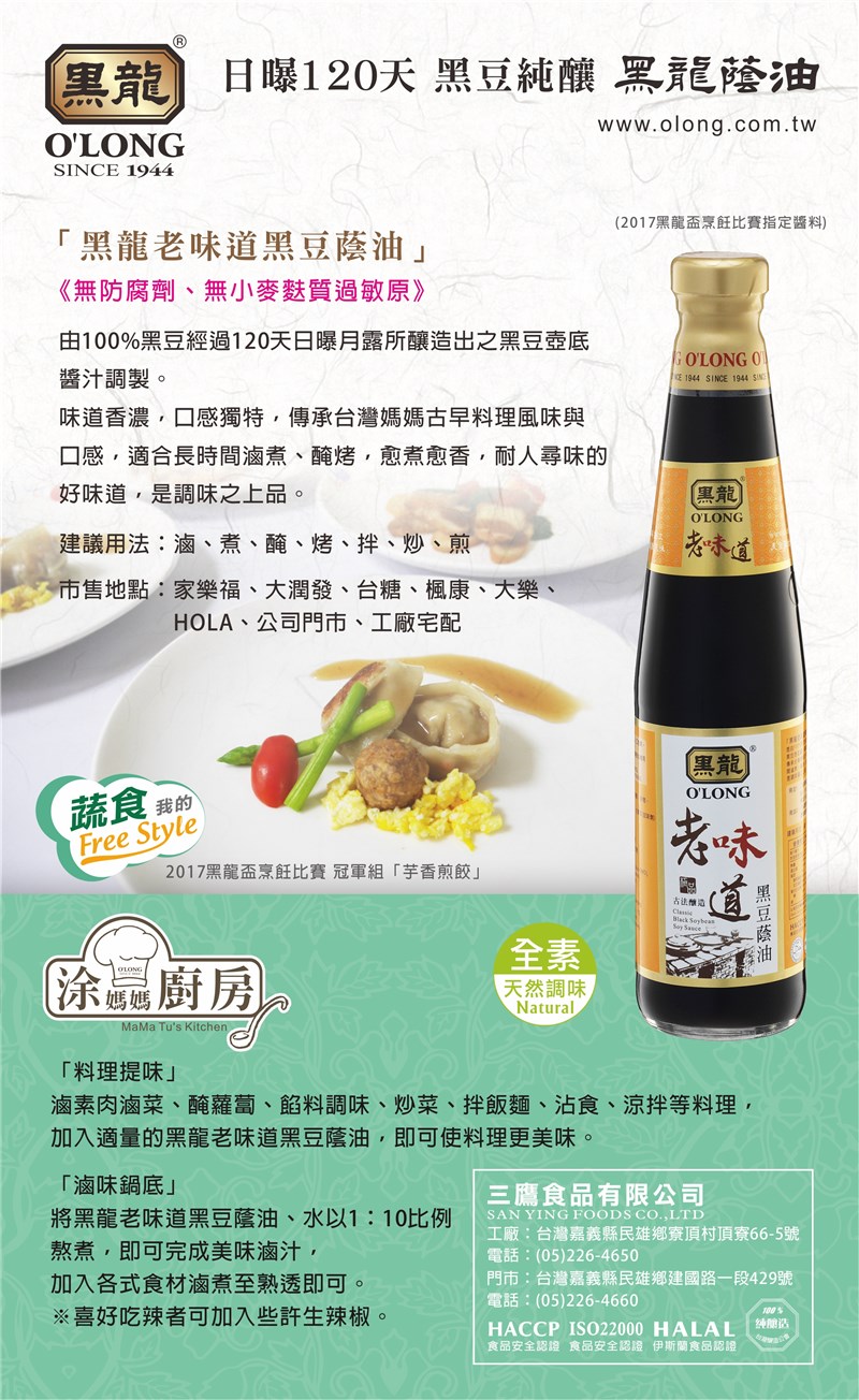 調味料:食用油1大匙、黑龍純釀黑豆蔭油露10ml.、黑龍豆豉20克