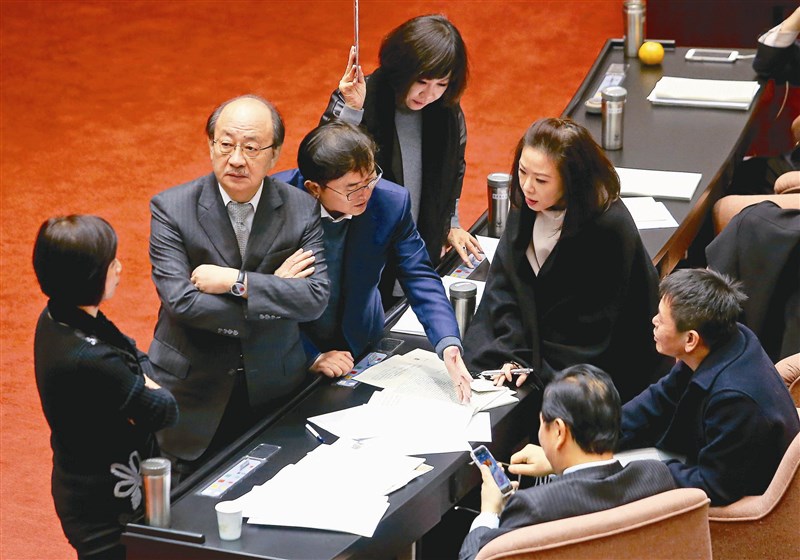 立院上周處理公投法修正草案,民進黨團總召柯建銘(左二)與國民黨團書記長林為洲(右)等人進行溝通。圖╱余承翰