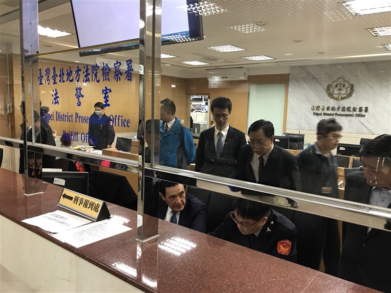 前總統馬英九(前右2)昨天下午親赴台北地檢署控告北檢洩密,在法警室中辦理相關程序。圖/取自網路