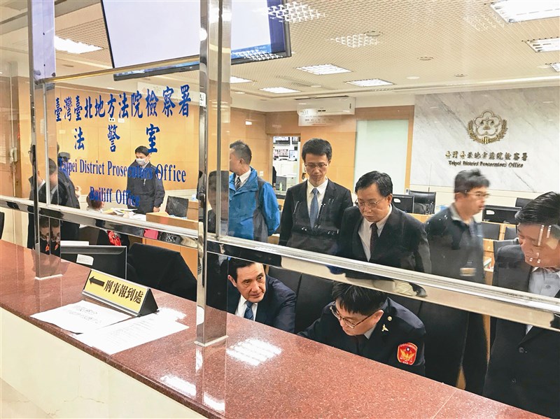 前總統馬英九(前左)昨天下午親赴台北地檢署控告北檢偵查三中案時洩密,在法警室中辦理相關程序。圖/中央社
