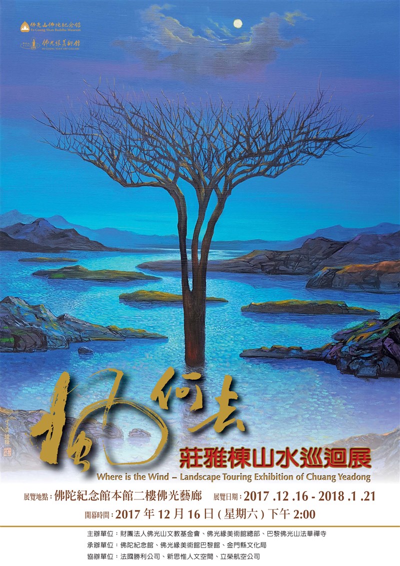 風何去─莊雅棟山水巡迴展 |2017.12.14 語音朗讀 973觀看次 字級 大 中 小 風何去─莊雅棟山水巡迴展 開幕時間:2017-12-16 下午2點 開幕地點:佛陀紀念館本館第三、四展廳 展覽地點:佛陀紀念館本館二樓佛光藝廊 展覽日期:2017-12-16至2018-01-21 展演緣起:台灣知名山水油畫藝術家莊雅棟傳承創新的山水新表現,融入了五彩歸位的徹底通透,畫山畫水交錯的皴法、交錯的色彩;多元油彩的線條厚度及變化,更給了山水不同面貌年輕氣息。山水應該可以如此多彩冒險!莊雅棟從畫中再造山水藝境的桃花源,這也是他對山水無窮盡的致敬! 前一篇文章 佛光文化新書 《幸福的白饅頭》─佛光山叢林學院參學記事 釋有敬/著 下一篇文章 美蔘國際專業研發優質保健營養品 熱門新聞 01【分數之外】看見另一種英文2026.04.0802降雨兩樣情 南部水庫沒解渴2026.04.0603MLB鄧愷威拆彈 守住今井旅美首勝2026.04.0604租賃車業者違法攬客 觀光署:最高罰200萬元2026.04.0705杉林溪園區 紫藤花盛開2026.04.0806清明豪雨 合歡溪出現新堰塞湖2026.04.0907計程車掛牌費喊到35萬元 交部出手2026.04.0808火金姑故鄉 賞螢好去處2026.04.0909哥國動盪城 變身世界圖書之都2026.04.0810【練瑜伽品生活】英雄式二 英雄不能只看正面2026.04.08 訂閱電子報 台北市 天氣預報 台灣一週天氣預報 相關報導 以文字護持人間福報運動睡眠新科技 養生保健新利器房仲第一品牌 永慶加薪3% 體驗美好手作 製皂幸福時光 博愛社大春季班招生中 薩克斯風吹奏春季班 人間大學台中分校招生中 跨越十年縱橫南半球到北半球 《行者》新書上市