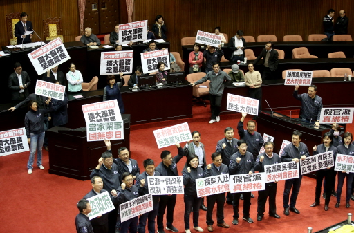 《農田水利會組織通則》修正草案,民進黨強勢表決,將草案逕付二讀,國民黨立委在議場高舉標語抗議。圖/余承翰