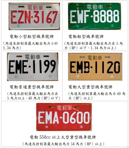 【本報台北訊】國內每年電動機車領牌數近10萬,交通部公路總局今天宣布,元旦起將針對新領牌照之電動機車核發專屬號牌,包含電動小型輕型機車、電動輕型機車、電動普通重型機車、電動大型重型機車、電動550cc以上大型重型機車等5款號牌。