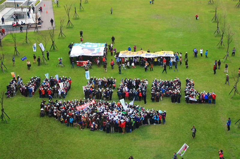 台中市反空汙遊行,民眾排出「NO COAL」大字象徵反煤。圖/中央社