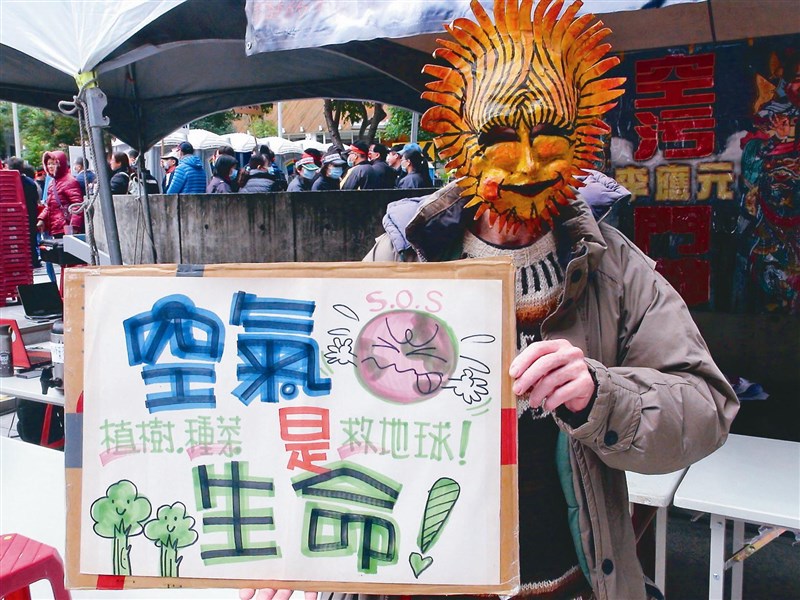 一名在台外籍人士戴上太陽面具,響應反空汙遊行。他說,來台二十五年,空氣品質真得很差,「空氣是生命,植樹種菜救地球」。圖/余采瀅