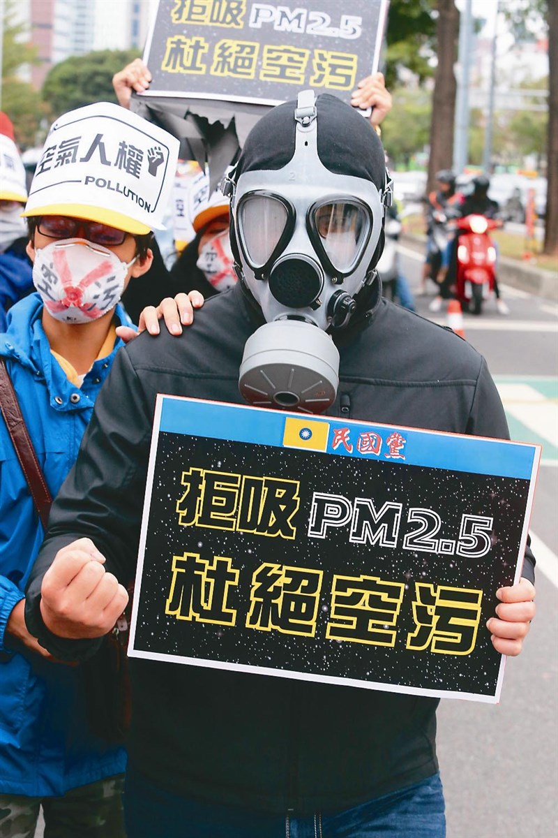 反空汙大遊行昨天在台中、高雄同步舉行,台中有民眾配戴防毒面具,表達「拒吸PM2.5,杜絕空汙」。圖/黃仲裕