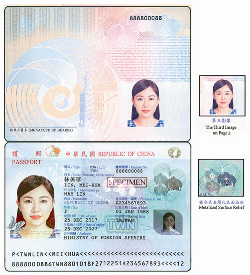 外交部表示,第二代晶片護照參採國際先進的護照防偽技術,包括增加持照人第三影像、防偽膠膜採用金屬化表面凸起等,使我國護照防偽功能再升級,以及全面更新護照內頁圖案等,納入台灣各縣市特色景點地標及風土民情等主題,以展現活力台灣風貌。