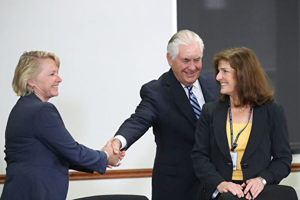 董雲裳(Susan Thornton)於12/19獲得川普提名為國務院亞太助理國務卿。圖為董雲裳(左)與國務卿蒂勒森(中)握手。圖/取自網路
