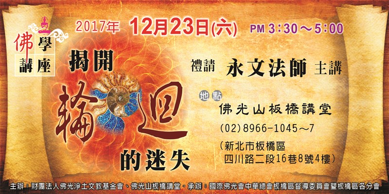 2017板橋講堂 佛學講座 |2017.12.21 語音朗讀 486觀看次 字級 大 中 小 時間:2017年12月23日(六)下午3:30~5:00 地點:佛光山板橋講堂 地址:新北市板橋區四川路二段16巷8號4樓 洽詢電話:02-8966-1045~7 前一篇文章 冬至吃桂冠湯圓 心暖人團圓 下一篇文章 2017極樂寺佛學講座 熱門新聞 01【分數之外】看見另一種英文2026.04.0802男子氣概照護員 日本長照新力量2026.04.0503【轉移注意力】往理想中的自己邁進2026.04.0504降雨兩樣情 南部水庫沒解渴2026.04.0605美課藥品重稅 台灣沒優惠 2026.04.0406一紙學歷換錢景 美學位價值遭質疑2026.04.0507租賃車業者違法攬客 觀光署:最高罰200萬元2026.04.0708【深頁凝視】《後院的鳥》凝神注視鳥兒登場2026.04.0509MLB鄧愷威拆彈 守住今井旅美首勝2026.04.0610暴雨狂炸苗栗 災情頻傳 2026.04.05 訂閱電子報 台北市 天氣預報 台灣一週天氣預報 相關報導 以文字護持人間福報運動睡眠新科技 養生保健新利器房仲第一品牌 永慶加薪3% 體驗美好手作 製皂幸福時光 博愛社大春季班招生中 薩克斯風吹奏春季班 人間大學台中分校招生中 跨越十年縱橫南半球到北半球 《行者》新書上市