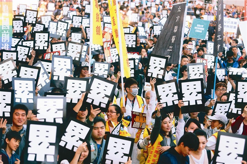 全台一百個工會、勞團、民團眼見多場抗議無效,勞基法修法已通過立法院初審,昨舉辦反勞基法修惡大遊行,學者、親子、學生社團、一般上班族都響應;北市勞動局長賴香伶,及國民黨立委蔣萬安、陳宜民、林德福、王育敏,以及時代力量立委黃國昌、徐永明等人,也都到場聲援。