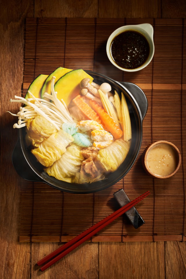 「果然匯」新推出三款火鍋料理,以「香、辣、酸」為主軸,「十全藥膳鍋」以人蔘、當歸、川芎等藥材配上藥酒,添入枸杞及紅棗,湯頭清爽香氣十足,是冬天不能錯過的進補好滋味;一吃辣上癮的「川蜀麻辣鍋」湯頭使用花椒、青花椒、燈籠椒熬製,湯紅濃郁、香麻帶勁,讓人口水直流;「東北酸白菜鍋」酸中帶甘,口味清爽。主廚精心條配的醬料有「香椿嫩芽醬」、「味噌風味醬」、「柑橘大根醬」、「豆乳芝麻醬」,各有滋味,與火鍋是最佳拍檔,顯現出蔬食宴視覺與味覺的千變萬化,2018年2月底前限定供應。