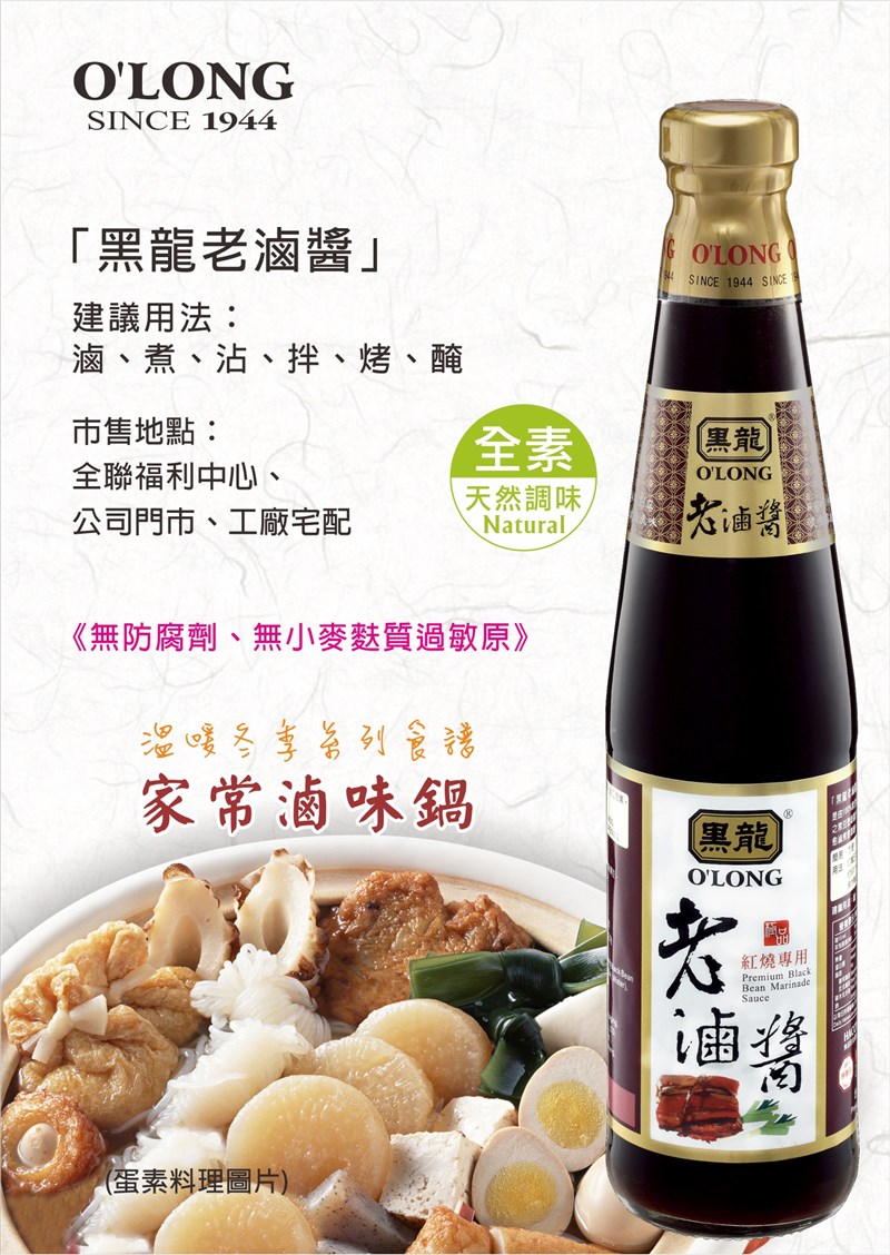 是以100%黑豆經過120天日曝月露所釀造出之黑豆壺底原汁,加入天然糯米漿調製。 無防腐劑、無小麥麩質過敏原,老滷醬味道香濃甘醇,適合長時間滷煮,口感回甘,適合滷、煮、沾、拌、烤、醃,愈滷煮愈香愈好吃。全聯福利中心、公司門市、工廠宅配皆有售。