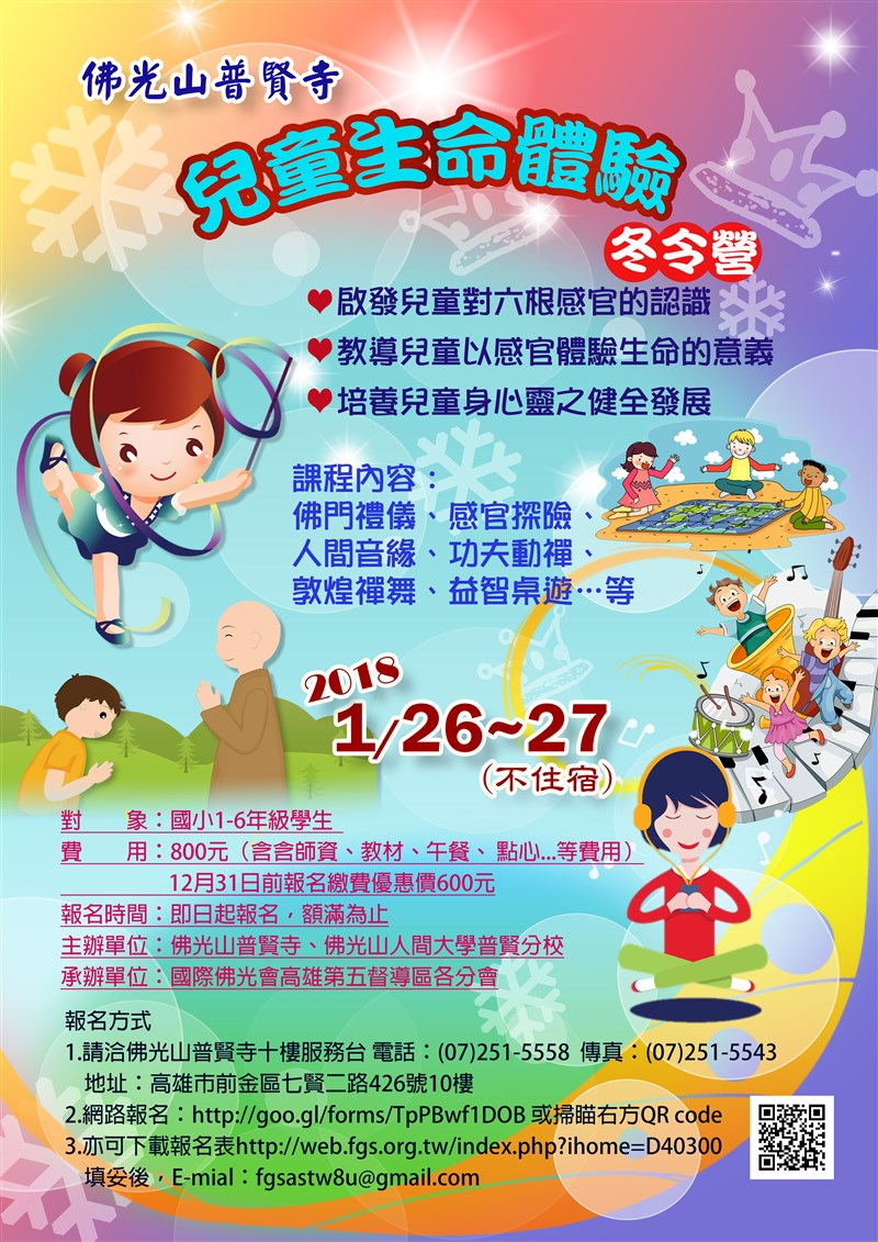 佛光山普賢寺2018年兒童生命體驗冬令營報名囉~ |2017.12.30 語音朗讀 814觀看次 字級 大 中 小 1.日期:2018/01/26(五)–01/27(六),共2天,不住宿 2.時間:早上8:00 ~ 下午17:00 3.地點:佛光山普賢寺 4.課程內容:佛門禮儀、感官探險、人間音緣、功夫動禪、敦煌禪舞、益智桌遊…等 5.活動費用:800元(12/31前報名費用600)(含師資、教材、午餐、點心...等費用) 報名:http://goo.gl/forms/TpPBwf1DOB 前一篇文章 「黑龍老滷醬」味道香濃甘醇 全聯福利中心均售 下一篇文章 「中華電信x網友共創」 新款LINE貼圖 綁定中華LINE官方帳號 iPhone X、OPPO手機大方抽 熱門新聞 01【讓愛自由】纏繞與獨立之間2026.04.0202明德水庫蓄水量僅27% 今起供4停42026.04.0103新生首次到校2026.04.0204星雲大師靈骨分燈日本 法燈長明2026.04.0105星雲大師靈骨分燈泰國 化益世人2026.04.0206東京櫻花滿開2026.04.01079公尺高恐龍 現身澄清湖2026.04.0108打字機重返課堂 對抗AI代寫2026.04.0209中美並重 鄭麗文傳6月訪美2026.04.0110睽違53年 NASA載人繞月1日升空2026.04.01 訂閱電子報 台北市 天氣預報 台灣一週天氣預報 相關報導 以文字護持人間福報運動睡眠新科技 養生保健新利器房仲第一品牌 永慶加薪3% 體驗美好手作 製皂幸福時光 博愛社大春季班招生中 薩克斯風吹奏春季班 人間大學台中分校招生中 跨越十年縱橫南半球到北半球 《行者》新書上市