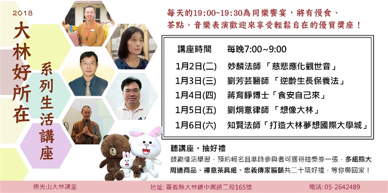 2018大林好所在系列生活講座 |2018.01.03 語音朗讀 374觀看次 字級 大 中 小 講座時間:每晚7:00~9:00 1月3日(三)劉芳芸醫生「逆齡生長保養法」 1月4日(四)蔣育錚博士「食安自己來」 1月5日(五)劉炯意律師「想像大林」 1月6日(六)知賢法師「打造大林夢想國際大學城」 講座地點:佛光山大林講堂 地址:嘉義縣大林鎮中興路二段165號 電話:05-2642-489 前一篇文章 人間福報誠徵多媒體技術人員 下一篇文章 佛光山台北道場2018三好禪修冬令營 熱門新聞 01最大規模無王日 逾3200場反川示威2026.03.3002宜蘭綠博會 探索真理2026.03.3003陸首都維安 北京全面管制無人機2026.03.3004MLB 鄧愷威轉隊太空人 初登板奪首勝2026.03.3005美首批陸戰隊抵中東 地面戰在即2026.03.3006乾旱嚴峻 雲林古坑春茶產量腰斬2026.03.3007北韓強化戰略武器2026.03.3008拉斐爾壁畫2026.03.3009昆士蘭協會 榮獲洛根市文化影響力獎2026.03.3010剛果文化壁畫2026.03.30 訂閱電子報 台北市 天氣預報 台灣一週天氣預報 相關報導 以文字護持人間福報運動睡眠新科技 養生保健新利器房仲第一品牌 永慶加薪3% 體驗美好手作 製皂幸福時光 博愛社大春季班招生中 薩克斯風吹奏春季班 人間大學台中分校招生中 跨越十年縱橫南半球到北半球 《行者》新書上市