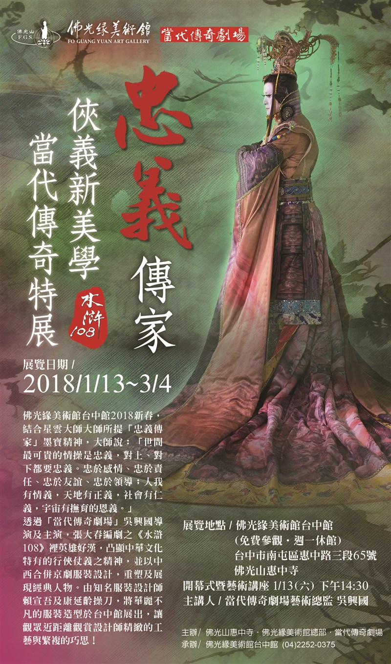 在觀眾進劇場觀戲之前,特別企劃「忠義傳家─俠義新美學‧水滸108當代傳奇特展」,將《水滸108》華麗不凡的服裝造型分享給每一位愛戲人,讓民眾能近距離欣賞設計師精緻的工藝與繁複的巧思。
