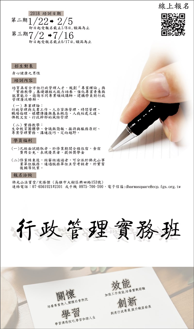 培訓內容:具有全方位行政管理人才,規劃「專業理論」與「實物教學」基礎課程之能力培養,強化專業素養與就業能力,邀請不同專業領域講師,建構學員對行政管理廣泛瞭解。