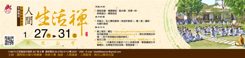 2018生命教育 全國教師禪修營 人間生活禪 |2018.01.09 語音朗讀 297觀看次 字級 大 中 小 活動內容:禪修指導、專題課程、動中禪、茶禪一味、與佛接心、禪修座談 參加對象:各級公、私立學校教師(含退休教師)、檀(教)講師、社輔部教師 報名日期:即日起至2018年1月10日止,每場限200人,額滿截止。 聯絡電話:02-2762-0112轉2537、2391 Emial:blia928teacher@gmail.com 前一篇文章 2018福慧家園共修會 下一篇文章 新年除舊布新 佛堂 居家布置 熱門新聞 01渥太華佛光山 授海狸童軍領巾2025.11.1702【詩】遊園地.競馬場2025.11.1703警告日本 陸黃海軍演、籲暫勿遊日 2025.11.1604落葉刺繡 巴西百鳥寫真集2025.11.1705墨西哥熱氣球節 高空爭豔2025.11.1606芬普尼毒蛋 又爆4萬顆流入市面2025.11.1607【快樂塗鴉簿】熱鬧的內灣小鎮2025.11.1708克林姆富家女肖像畫 估值46億元2025.11.1709中日緊張 陸4海警船巡航釣魚台2025.11.1710AMR機器人 是什麼?2025.11.17 訂閱電子報 台北市 天氣預報 台灣一週天氣預報 相關報導 以文字護持人間福報運動睡眠新科技 養生保健新利器房仲第一品牌 永慶加薪3% 體驗美好手作 製皂幸福時光 博愛社大春季班招生中 薩克斯風吹奏春季班 人間大學台中分校招生中 跨越十年縱橫南半球到北半球 《行者》新書上市