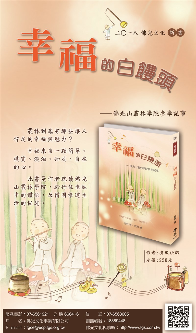 《幸福的白饅頭》描述佛光山叢林學院僧團修道生活的自在快樂,於行、住、坐、臥中的體悟,猶如白饅頭製作過程,經過耐心揉壓,成就「幸福的白饅頭」。
