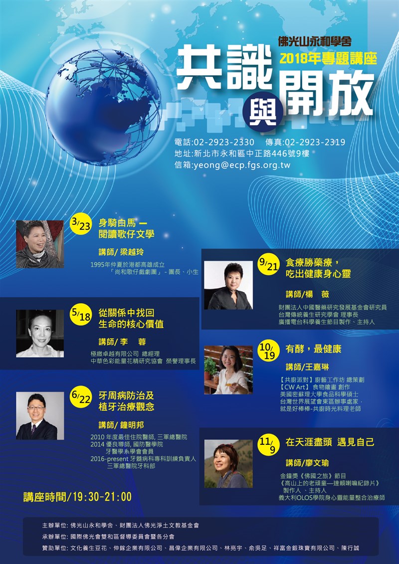 佛光山永和學舍2018專題講座 共識與開放 |2018.01.13 語音朗讀 412觀看次 字級 大 中 小 3/23 身騎白馬-閱讀歌仔戲文學 講師/梁越玲 5/18從關係中找回生命的核心價值 講師/李蓉 6/22牙周病防治及植牙治療觀念 講師/鐘明邦 9/21食療勝藥療,吃出健康身心靈 講師/楊薇 10/29有酵,最健康 講師/王嘉琳 11/9在天涯盡頭 預見自己 講師/廖文瑜 講座時間:19:30-21:00 電話:02-2923-2330 地址:新北市永和區中正路446號9樓 前一篇文章 佛光山佛陀紀念館 人才召集令 下一篇文章 「黑龍純釀黑豆蔭油露」 熱門新聞 01【斗室有燈】老男冒險記2025.11.1402【經典新話】歸亞蕾 超越世代傳奇影后2025.11.1503【詩】遊園地.競馬場2025.11.1704【大師身影】 曲歌繞梁: 弘一大師李叔同(下) 2025.11.1405【營養專欄】掌握五原則 輕鬆控糖2025.11.1506法華禪寺 彩繪燈籠2025.11.1507佛光山頒三好助學金 鼓勵學生安心學業2025.11.1408【海闊天空】濟州島旅記 解鎖美景美食2025.11.1509落葉刺繡 巴西百鳥寫真集2025.11.1710慢性發炎易罹癌、失智 葡萄、花椰菜修復細胞2025.11.14 訂閱電子報 台北市 天氣預報 台灣一週天氣預報 相關報導 以文字護持人間福報運動睡眠新科技 養生保健新利器房仲第一品牌 永慶加薪3% 體驗美好手作 製皂幸福時光 博愛社大春季班招生中 薩克斯風吹奏春季班 人間大學台中分校招生中 跨越十年縱橫南半球到北半球 《行者》新書上市