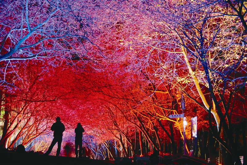 九族櫻花祭今年首次推出櫻花認養,部分所得捐助社福基金會,圖為九族櫻花祭夜晚的櫻花。圖/中央社