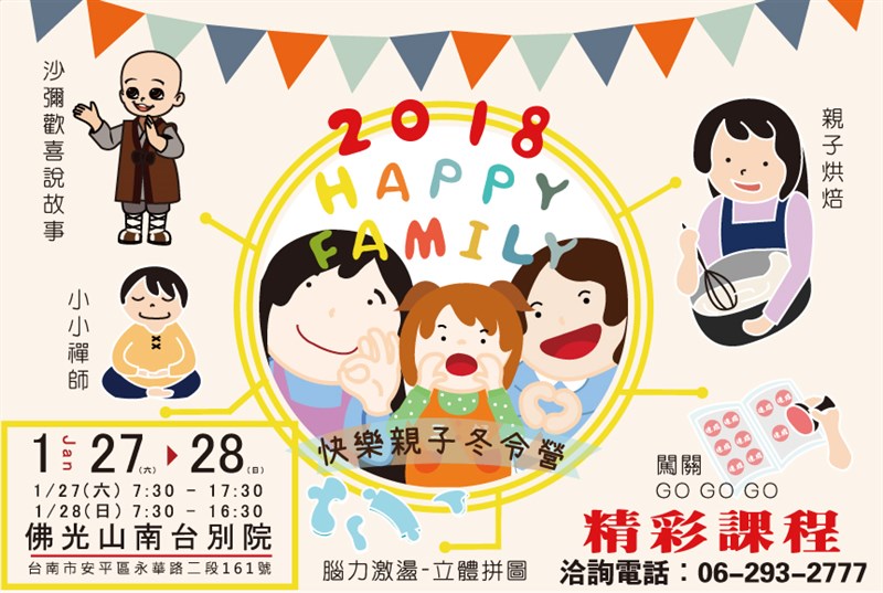 佛光山南台別院快樂親子冬令營 |2018.01.26 語音朗讀 294觀看次 字級 大 中 小 活動日期:2018年1月27日至28日 活動時間:1月27日7:30至17:30 1月28日7:30至16:30 豐富有趣的精采課程歡迎大眾來電洽詢:06-293-2777 地址:台南市安平區永華路二段161號(佛光山南台別院 前一篇文章 佛光山青年義工研習營 報名即將結止 下一篇文章 佛光山寶塔寺誠徵 熱門新聞 01WTA、ATP年終賽 獎金創新高2025.11.0702台中新社花海 重現經典卡通2025.11.0603佛光佈教師、友愛服務隊 精進行佛2025.11.0604《365日》贈嘉義香湖國際大飯店 佛光人結書香善緣2025.11.0605【生活快門】 喜見採茶女2025.11.0606水星室內樂團表演 中美寺傳遞愛與和平2025.11.0607健保補充保費變革 政院急踩煞車2025.11.0708日中文化藝術季 大阪佛光合唱團獻唱2025.11.0609【牽手一生】 最深的愛是 我陪你2025.11.0610再闖WTA年終賽 謝淑薇力拚第2冠2025.11.07 訂閱電子報 台北市 天氣預報 台灣一週天氣預報 相關報導 以文字護持人間福報運動睡眠新科技 養生保健新利器房仲第一品牌 永慶加薪3% 體驗美好手作 製皂幸福時光 博愛社大春季班招生中 薩克斯風吹奏春季班 人間大學台中分校招生中 跨越十年縱橫南半球到北半球 《行者》新書上市