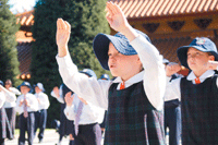 來「吸~呼~吸~呼」的可愛聲音。來自St. Sinbar's School近七十名小學生及師長,在寺院丹墀進行太極課程。活潑可愛的小學生配合指導法師,將每一個動作都做得認真且歡喜不已。