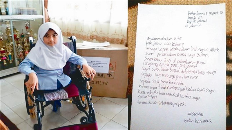 沒想到這封信獲得佐科威的關注,他自掏腰包買了一台輪椅送給布蘭。這台輪椅二十日下午送抵布蘭就讀的小學,讓她又驚喜又感動。