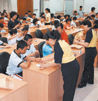 三百六十位弱勢學生分成兩個梯次,聚集在大禮堂,在王淑玲的指導下,左手拿各式卡通動物造型的香包,右手拿安全性設計的針線,認真的穿針引線,也專注的縫製,有幾位同學不時往桌子底下,尋找掉落的材料,佛光會員也幫忙找的畫面,引起哄堂大笑,好像也為佛光人上了一堂耐心和愛心課。