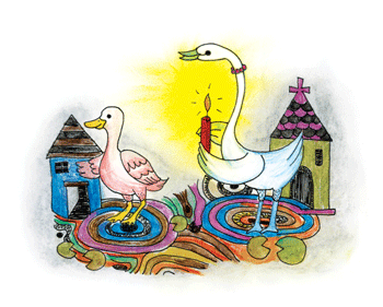 白鵝的女兒把蠟燭遞在天鵝小姐手上,摸著黑回家。
