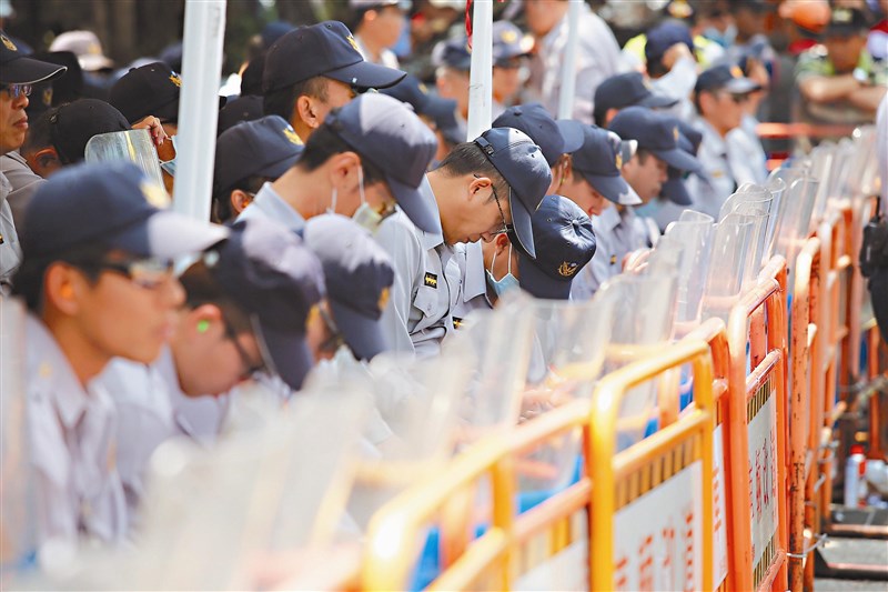 八百壯士雖宣布活動解散,但月底前仍有反年改團體在立法院周遭申請路權,陳抗活動可能繼續上演,繁重的勤務讓警察疲累不堪。圖╱高彬原