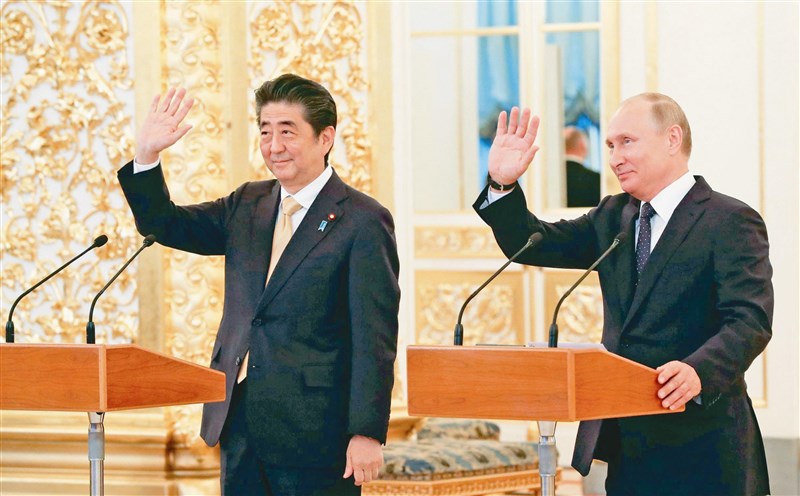 日本共同社報導,日本首相安倍晉三(圖左)與俄羅斯總統普亭,二十六日晚在莫斯科大劇院出席以日俄廣泛文化交流為目標的開幕式。圖/法新社