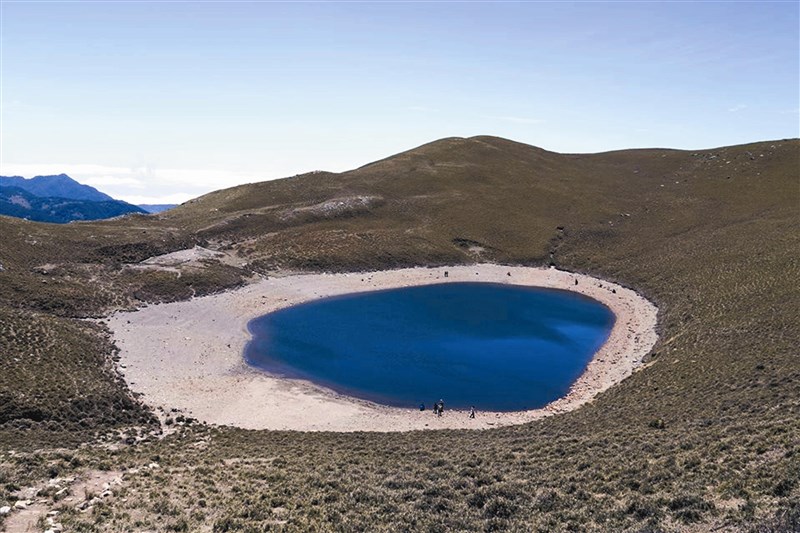嘉明湖因沒有雨水注入,只剩下六分滿(圖),與滿水位時(圖)相較,山友形容「就像一個荷包蛋」。圖/中央社