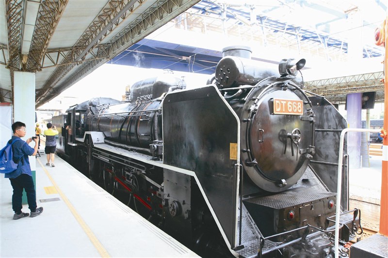 被譽為「蒸汽火車之王」的DT668蒸汽火車頭,從彰化扇形車庫行駛到火車站月台展示,吸引許多鐵道迷拍照留念。圖/中央社