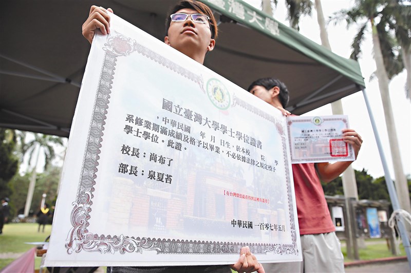 台大自主聯盟發起奉茶活動恭喜畢業生,並製作了一張畢業證書,上面校長名字寫著「尚不了」,部長名字則是「泉夏苔」,想要表達的心情不言而喻。圖/余承翰