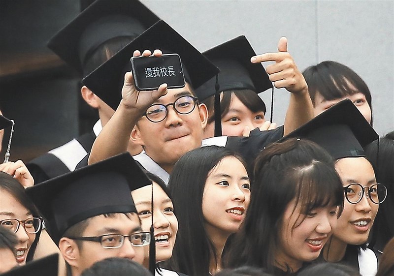 台灣大學昨天舉行畢業典禮,管理學院畢業生以手機秀出「還我校長」。圖/余承翰