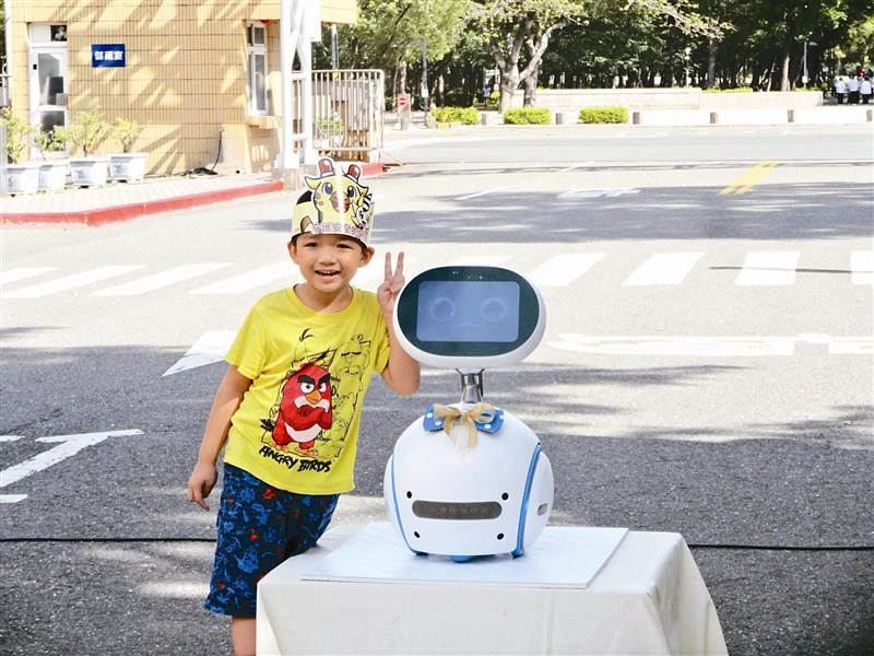 高市交通單位引進造型可愛的機器人擔任親善大使宣導交通安全,小朋友聽完宣導,開心的與機器人合影。