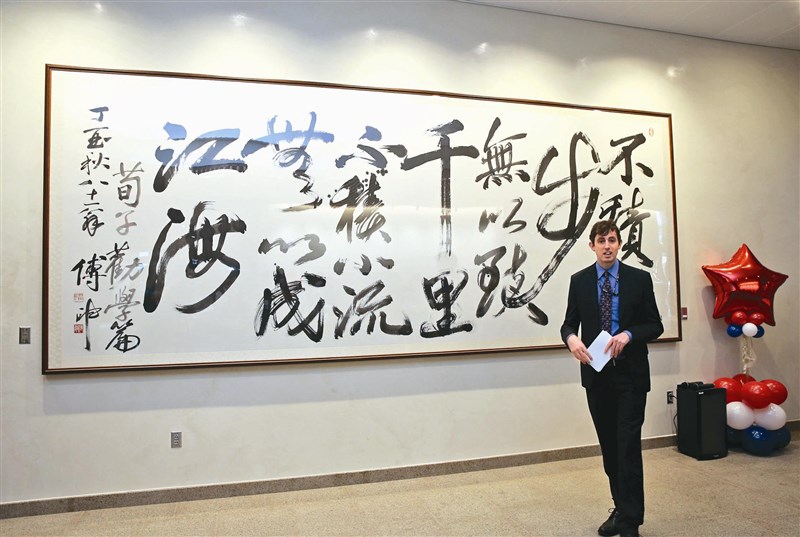 館內大廳掛著書法家傅申作品─荀子勸學篇。圖/林俊良