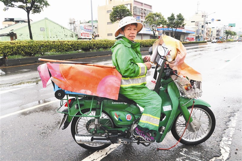 下雨天送信,施麗美會在機車後座綁根棍子,以防門鈴漏電。圖/翁禎霞