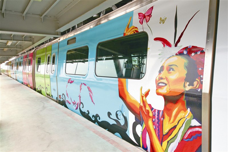 為推廣海洋旅遊,交通部觀光局與桃園捷運公司合作,彩繪機場捷運普通車及直達車各一列,湛藍海水中的海島風情,讓列車有活潑又透清涼。圖/中央社
