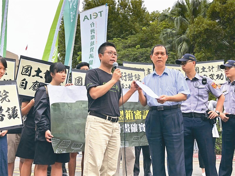 地球公民基金會執行長李根政(前左)昨日到行政院遞交異議書給行政院交通環境資源處副處長吳政昌,對行政院國土計畫審議過程提出質疑。圖/中央社