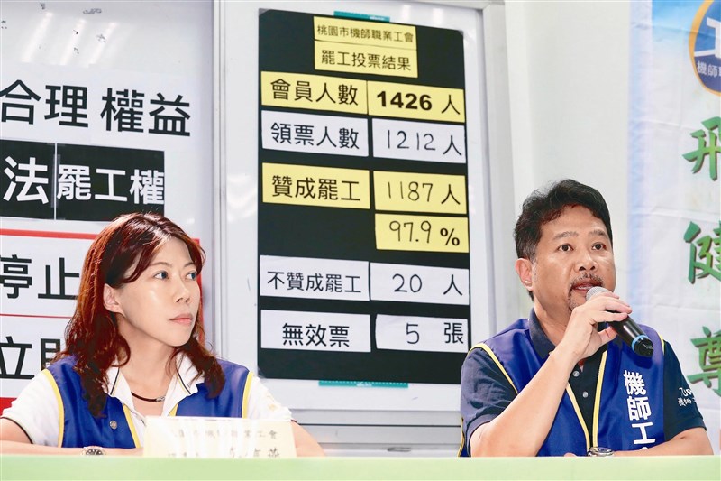 由長榮機師、華航機師組成的桃園市機師職業工會,從上月十六日起至前日舉行罷工投票,總計一千四百二十六名會員中,有一千二百一十二名投票,昨日上午於桃園市工會辦公室進行開票;長榮會員投下四百六十九票,四百五十四人贊成,十四人反對,一人廢票,同意率百分之九十六點八;華航會員投下七百四十一票,七百三十一人贊成,六人反對,四人廢票,同意率百分之九十八點六;在桃園市政府勞動局官員與律師見證下,宣告取得罷工權。