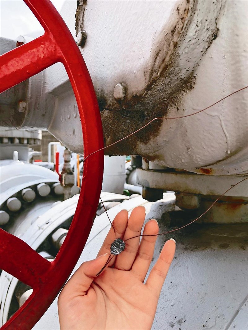 大潭天然氣計量站占地不大,卻是去年八一五全台大停電的肇因地。目前大潭計量站的手閥被綁上一條銅絲(圖),方便隨時觀察是否操作有誤。圖/高詩琴