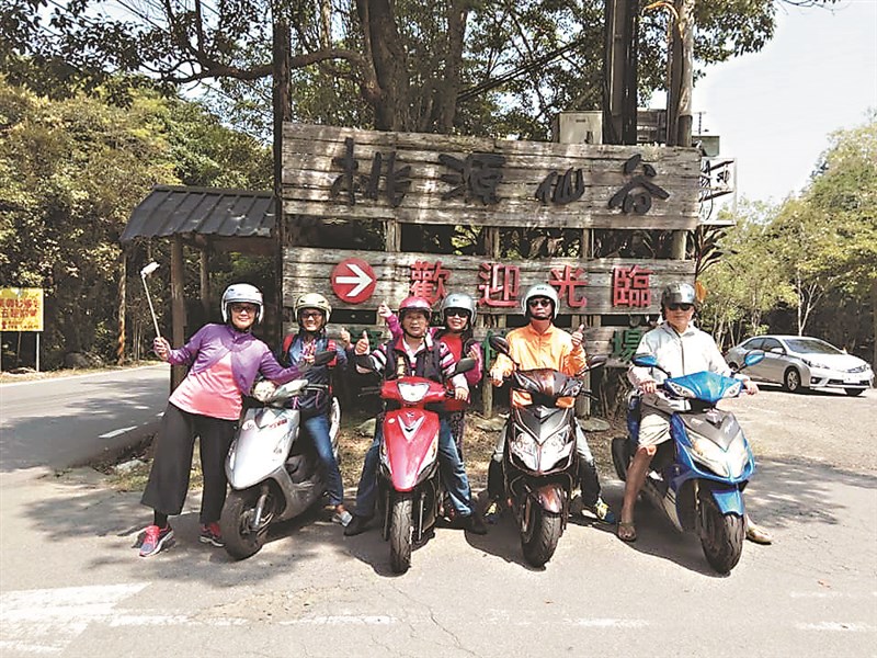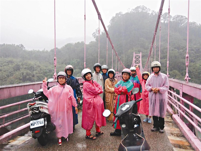 新竹市光華里里長張慶榮親自帶隊,騎機車從新竹市出發到桃園市復興區賞風景、泡溫泉等,即使下大雨,也澆不息大家的熱情。圖/張慶榮提供